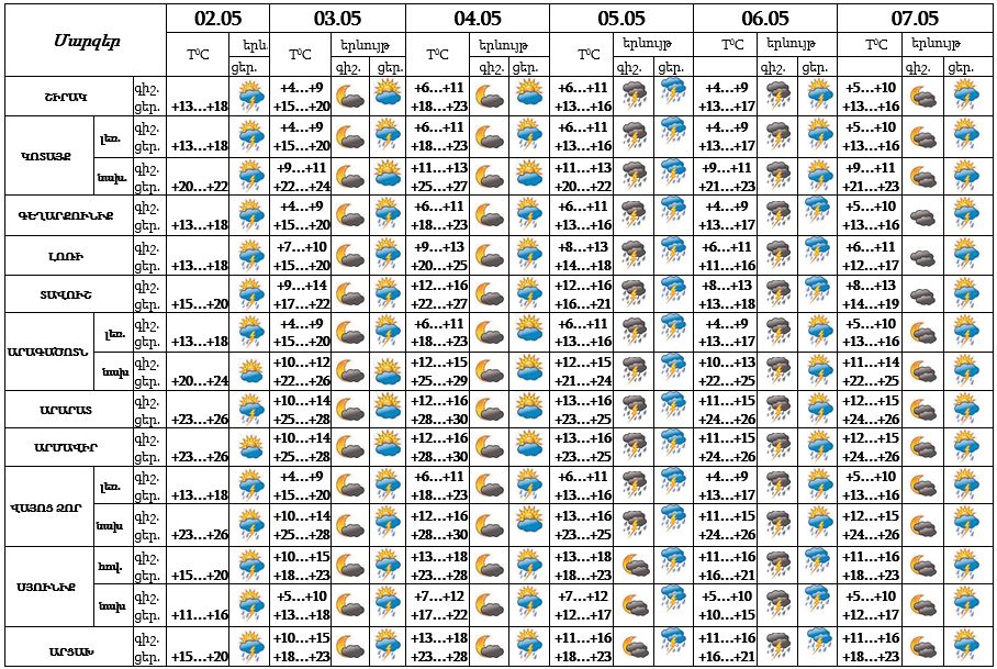 Հայաստանի տարածքում մայիսի 2-ի ցերեկը շրջանների զգալի մասում, 3-4-ն՝ առանձին շրջաններում հատկապես կեսօրից հետո սպասվում է կարճատև անձրև և ամպրոպ: Մայիսի 5-6-ը ժամանակ առ ժամանակ, 7-ի կեսօրից հետո բոլոր շրջաններում սպասվում է անձրև և ամպրոպ՝ տեղ-տեղ ինտենսիվ: Առանձին հատվածներում հնարավոր է կարկուտ։ Մայիսի 3-4-ի, 7-ի գիշերը սպասվում է առանց տեղումների եղանակ: