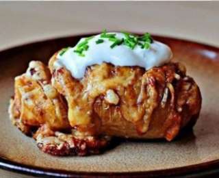 Կարտոֆիլները մաքրել, գրեթե մինչև վերջ մի քանի զուգահեռ կտրվածքներ անել: Բացված արանքներում բեկոնի կամ ճարպի բարակ շերտեր դնել: