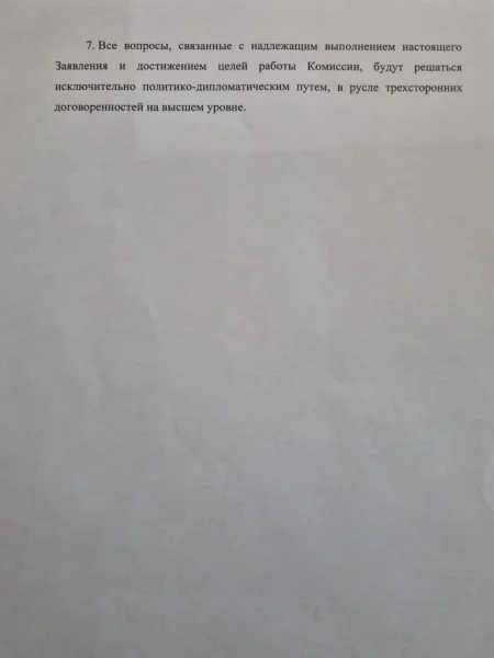 - Բոլոր հարցերը, որոնք կապված են Հայտարարության ապահով իրականացման հետ եւ Հանձնաժողովի աշխատանքների իրականացման հետ, պետք է իրականացվեն միայն դիվանագիտական եւ քաղաքական ճանապարհով՝ եռակողմ համաձայնագրի հիման վրա: