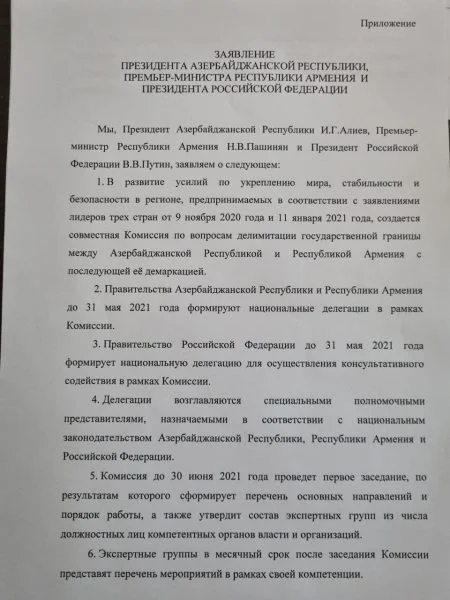Մենք՝ Ադրբեջանի նախագահ Իլհամ Ալիևը, ՀՀ վարչապետ Նիկոլ Փաշինյանը եւ ՌԴ նախագահ Վլադիմիր Պուտինը հայտարարում են հետևյալի մասին.