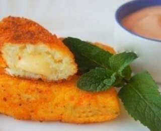 5. Խոնավ ձեռքերով ձևավորել կարտոֆիլային ձողիկներ, մեջտեղում դնելով պանիրը, գլորել պաքսիմատի մեջ և չորս կողմից տապակել բուսայուղի մեջ մինչև կարմրելը:
