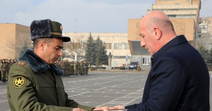 Վկայագրերն ու խորհրդանշական սպայական դաշույնները ֆակուլտետի շրջանավարտներին է հանձնել պաշտպանության նախարարի տեղակալ Արման Սարգսյանը։