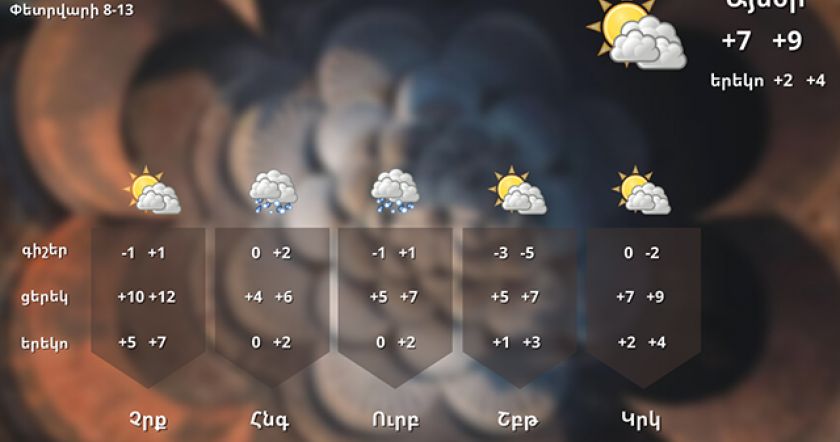 Փետրվարի 8-ի ցերեկը, 9-ին, 11-ի ցերեկը, 12-13-ը սպասվում է առանց տեղումների եղանակ: Փետրվարի 10-ին, 11-ի գիշերը սպասվում են տեղումներ: