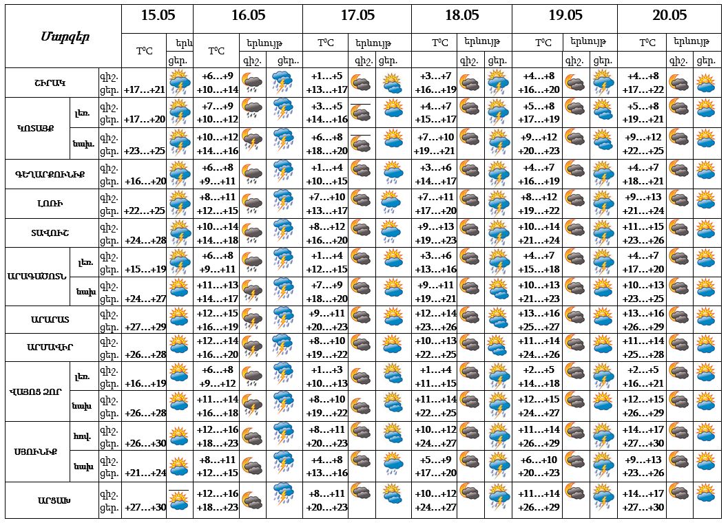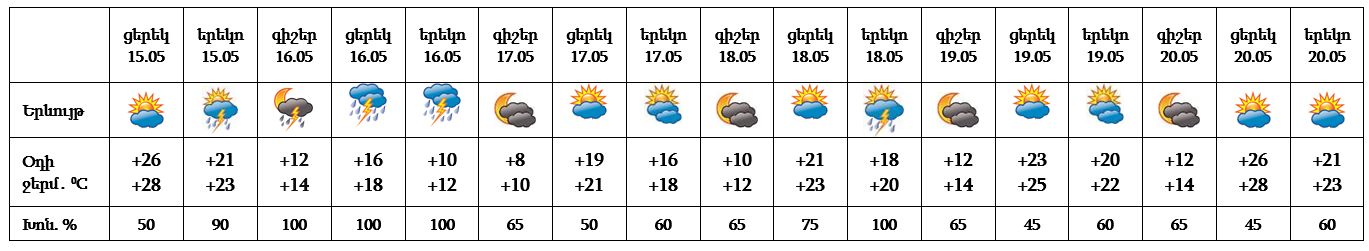 Մայիսի 15-ի և 18-ի երեկոյան ժամերին, 16-ին ժամանակ առ ժամանակ սպասվում է անձրև և ամպրոպ, ամպրոպի ժամանակ քամու ուժգնացում՝ 15-18 մ/վ: Մայիսի 17-ին, 18-ի գիշերը, 19-20-ը սպասվում է առանց տեղումների եղանակ: