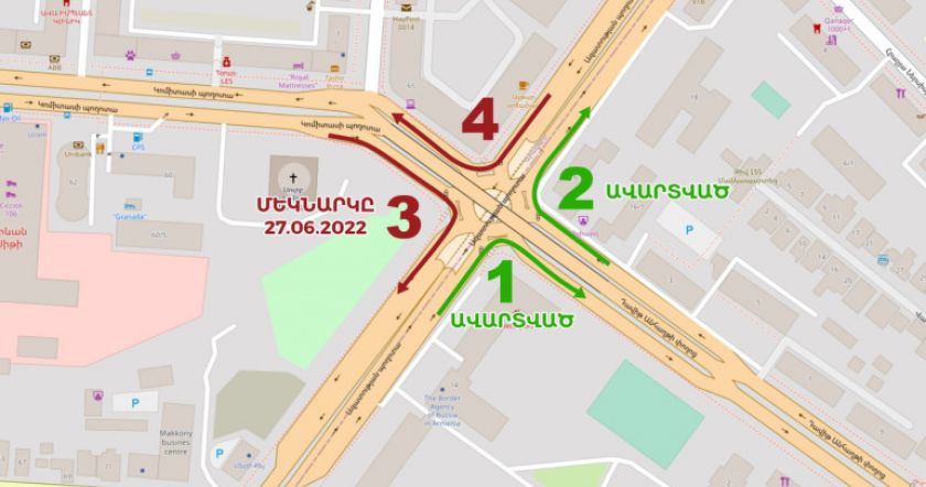 Հունիսի 27-ից ժամանակավորապես կփակվի Ազատության պող.-Դ. Անհաղթի փող. (Լամբադա) տրանսպորտային հանգույցի՝ Կոմիտասի պող.-Ազատության պող. ուղղությունը։
