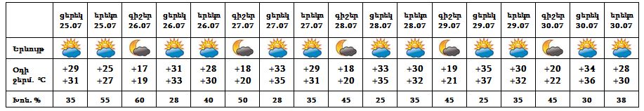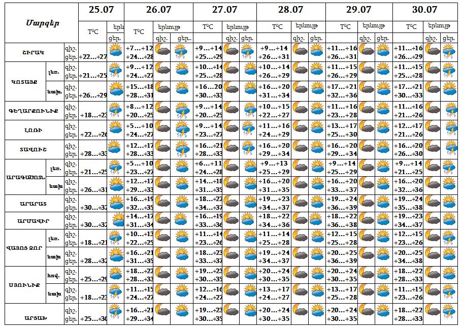 Հանրապետության տարածքում հուլիսի 25-27-ի, 30-ի կեսօրից հետո առանձին շրջաններում սպասվում է կարճատև անձրև և ամպրոպ: Հուլիսի 28-29-ը սպասվում է առանց տեղումների եղանակ: