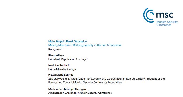 Հրապարակված օրակարգում պանելային քննարկումների բաժնում երևում է, որ «Շարժել լեռնե՞ր. Անվտանգության կառուցում Հարավային Կովկասում» վերտառությամբ պանելային քննարկմանը մասնակցելու են Ադրբեջանի նախագահ Իլհամ Ալիևը և Վրաստանի վարչապետ Իրակլի Ղարիբաշվիլին, ինչպես նաև ԵԱՀԿ գլխավոր քարտուղար Հելգա Մարիա Շմիդը: