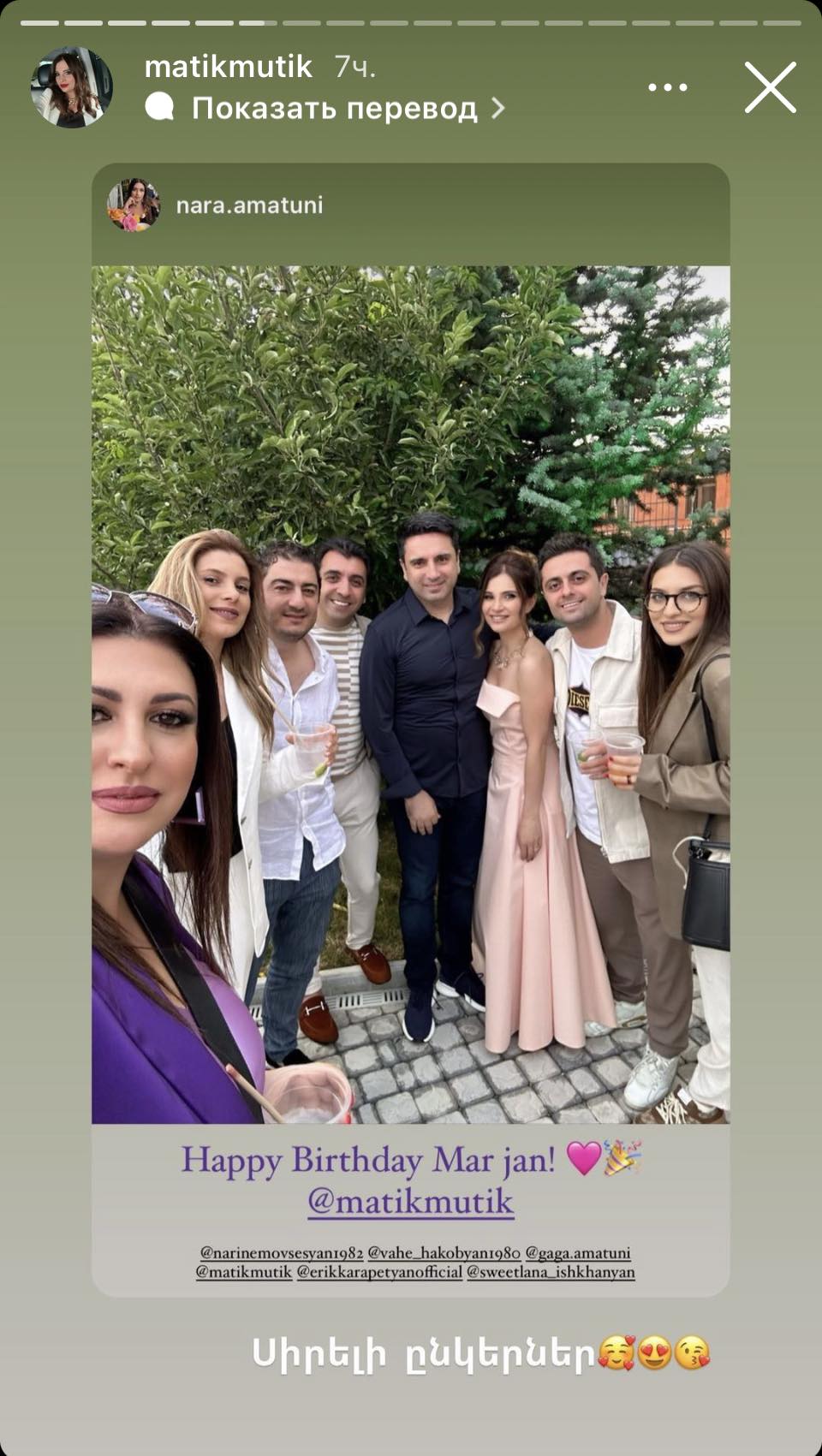 ԱԺ նախագահ Ալեն Սիմոնյանի կինն իր ինստագրամյան «Սթորի» բաժնում իր ծննդյան օրվանից հրապարակել է տեսանյութեր և լուսանկարներ: Տեսանյութերից մեկում նա ցույց է տվել, թե ինչպես է երգչուհի Սրբուկը կատարում իր երգերից մեկը, իսկ հոլովակին կից գրել. «Շնորհակալ եմ, ջանիկ, իմ օրն ավելի գժական դարձնելու համար»: