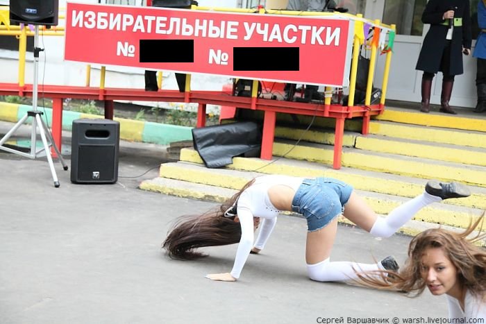 Ռուսաստանյան ընտրությունների քվեարկության տեղամասերից մեկի դիմաց սեքսուալ աղջիկներ են բերել, որոնց վճարել են որպեսզի ընտրության ամբողջ օրը պարային շարժումներ կատարեն, նման անսովոր մեթոդներով "ժողովրդի ընտրյալները" հրավիրում են իրենց վրա ուշադրություն դարձնել եւ ընտրողների քանակ են ապահովում