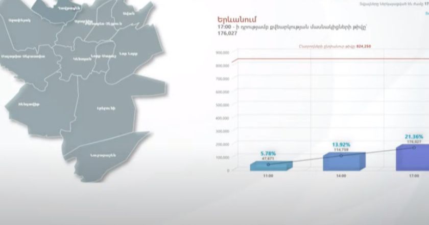 Ժամը 17-ի դրությամբ Երևանի ավագանու ընտրություններին մասնակցել է ընտրողների 21,36%-ը կամ 176,027 մարդ: