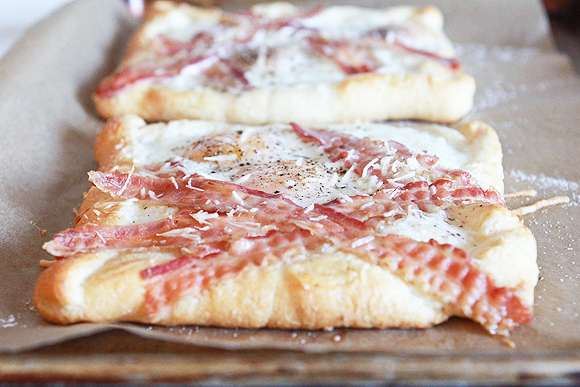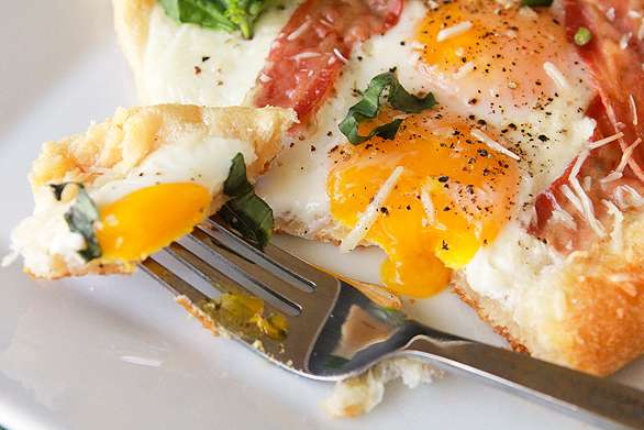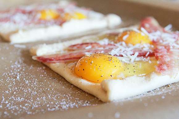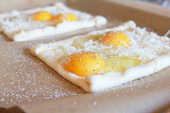 3. Ամեն մի քառակուսու վրա մի ձու կոտրեք, վրան շաղ տվեք քերած պանիրը, գեղեցիկ դրեք խոզապուխտի կտորը և 10 րոպեով ջեռոցը դրեք: