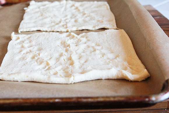 1. Տաքացրեք ջեռոցը մինչև 180 աստիճան: Խմորը բացեք, բաժանեք քառակուսի մասերի և շարեք տապակի մեջ հատուկ թղթի վրա: