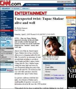 Թուփաք Շաքուրի մահն այսօր հանելուկ է: Նա ռեփ երգիչ էր, ով սպանվել է կրակոցից: Շատերը կասկածում են, որ իրականում նա դեռ ողջ է: Թերահավատները պնդում են, որ իրենց կասկածները միանգամայն հիմնավորված են, քանզի Թուփաքի ձայնասկավառակներից ութը թողարկվել են նրա մահից հետո, իսկ նրա երգերից մի քանիսում հիշատակվում է մի մարդ, ով գնդակահարվել է, սակայն դրանից հետո հարություն է առել: Ամսագրերի և աստղերի մասին բամբասանքներ հրապարակող կայքերի աշխատակիցները նշում են, որ իրենք տեսել են Թուփաքին և անգամ լուսանկարահանել են նրան: Ամենաթարմ լուսանկարում իբրև թե ենթադրյալ Թուփաքը խմում է Բուրբենի փողոցում: