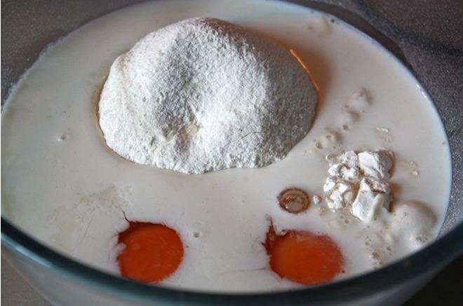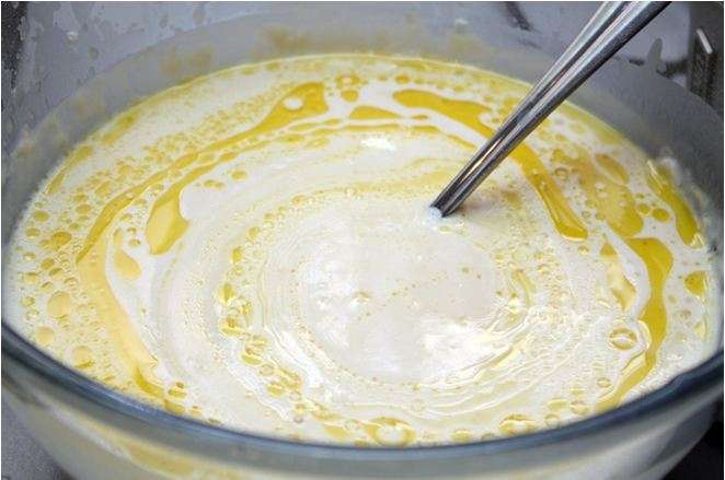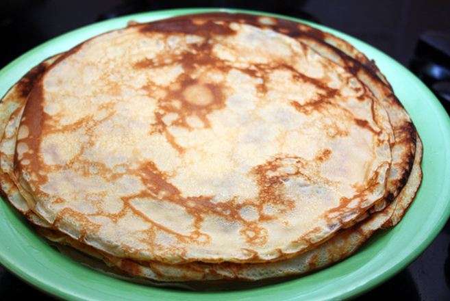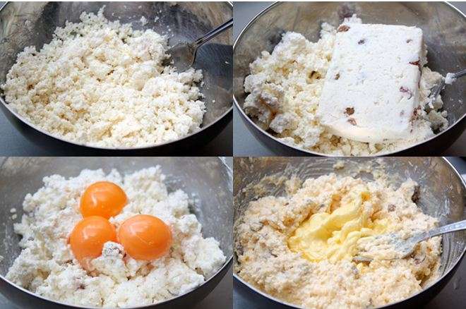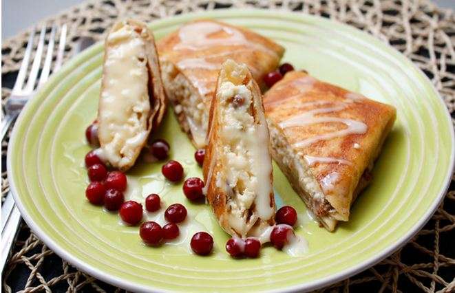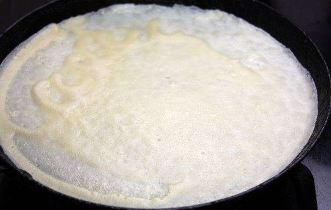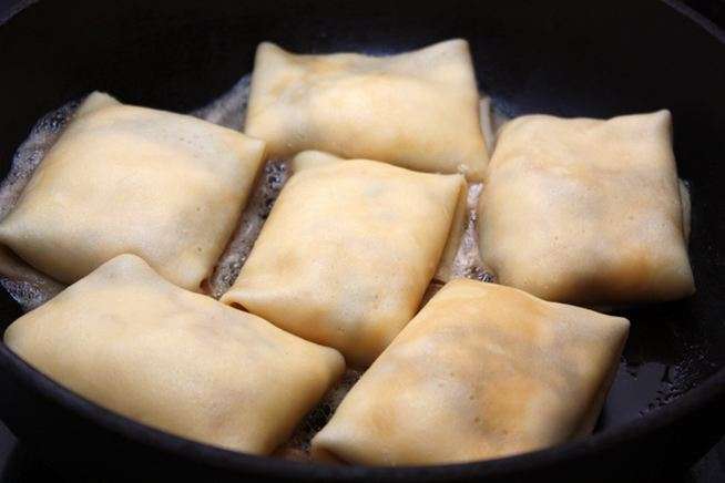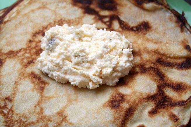 Ձվի վրա ավելացնել շաքարավազը, հարել, ավելացնել ալյուրը: Ջուրն ավելացնել անընդհատ խառնելով, որ գնդեր չառաջանան, ավելացնել 1 ճ/գդալ ձեթ: Տապակել տաքացրած ձեթապատ թավայի մեջ` կարմրացնելով 2 կողմից: Միջուկի համար կաթնաշոռի վրա ավելացնել շաքարավազ, ապա հարել մինչև կարագի նման դառնա: Բլիթը երկու հավասար մասի բաժանել և յուրաքանչյուր կեսի վրա կաթնաշոռ լցնել ու փաթաթել: Տապակի մեջ ձեթ լցնել ու փաթեթները երկու կողմից տապակել: Բարի ախորժակ: