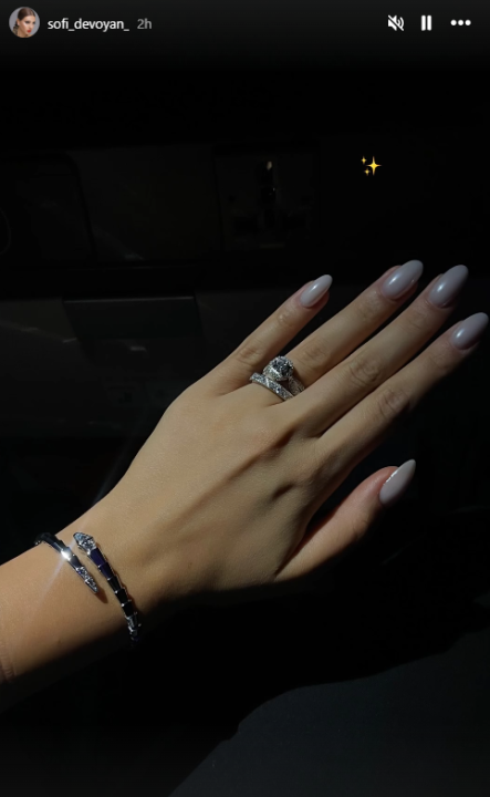 Պարուհի Սոֆի Դևոյան կրտսերը, ում հարսանիքն օգոստոսի 10-ին էր, այսօր ինստագրամյան story բաժնում հրապարակել է իր ամուսնական մատանու լուսանկարը․