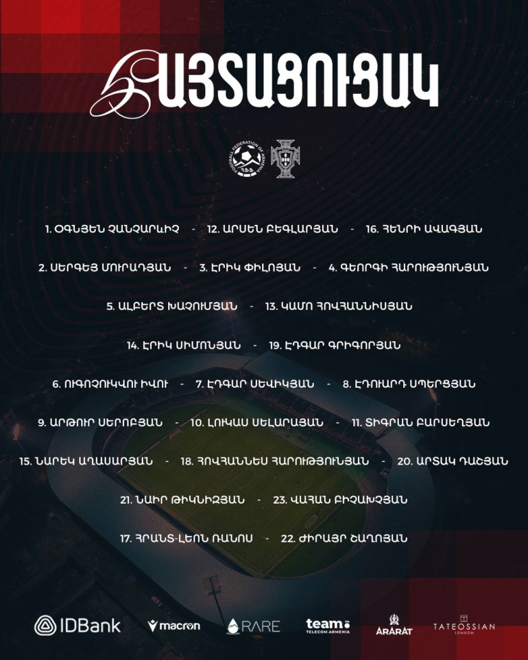 ՀՖՖ մամուլի ծառայությունը հրապարակել է Հայաստանի ազգային հավաքականի հայտացուցակը ԱԱ-2026-ի եվրոպական գոտու որակավորման փուլի F խմբի առաջին տուրում Պորտուգալիայի դեմ խաղի համար։