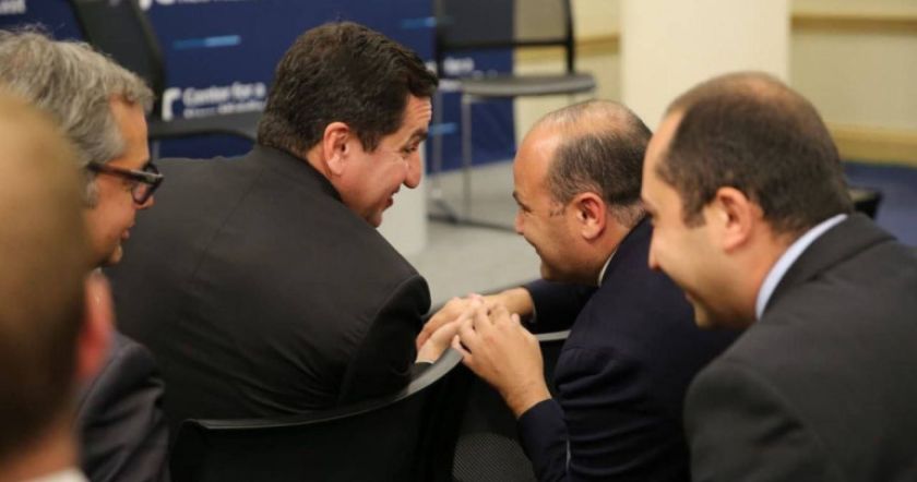Ձեռքսեղմում՝ ԱՄՆ-ում ՀՀ դեսպան Նարեկ Մկրտչյանի ու Ադրբեջանի նախագահի օգնական Հիքմեթ Հաջիևի միջև՝ «Աբրահամի համաձայնագրերի» հինգերորդ տարեդարձին նվիրված ԱՄՆ-ում կազմակերպված միջոցառման ժամանակ։
