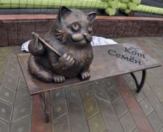 Բրոնզե արձանիկը պատկերում է կատվին՝ ուսին դրած կապոցով, որը նստել է նստարանին հանգստանալու, հայտնում է Интерфакс-ը: