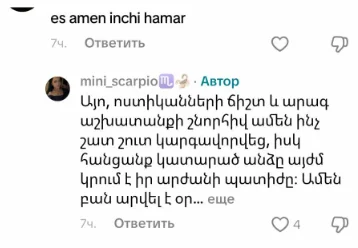 Դերասանուհին մեկնաբանությունների բաժնում նաև նշել է, որ «հանցանք կատարած անձն այժմ կրում է իր պատիժը»։