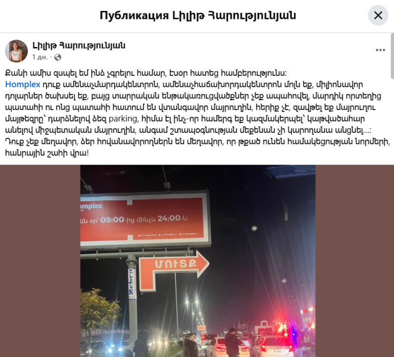 2 օր առաջ իրենց տոնածառի լույսերը վառելու համար կազմակերպած միջոցառման ու Աշտարակի խճուղում հսկայական խցանման պատճառ դարձած Homplex մոլի շուրջ կրքերը չեն հանդարտվում։ Օգտատերերից մեկի գրառման տակ քաղաքացիները բողոքում են, որ իրենց կազմակերպած համերգով ոտնահարել են մյուս մարդկանց իրավունքները, բողոքում են, որ խանութը լցված է թուրքական ապրանքներով ու շատ դժվար է ոչ թուրքական բան գտնել։ Ոմանք դժգոհում են նաև, որ միլիոններով գումար են ծախսել, բայց ամեն անցնելուց այցելուներից մեկը «թռնում» է մեքենայի դիմաց։