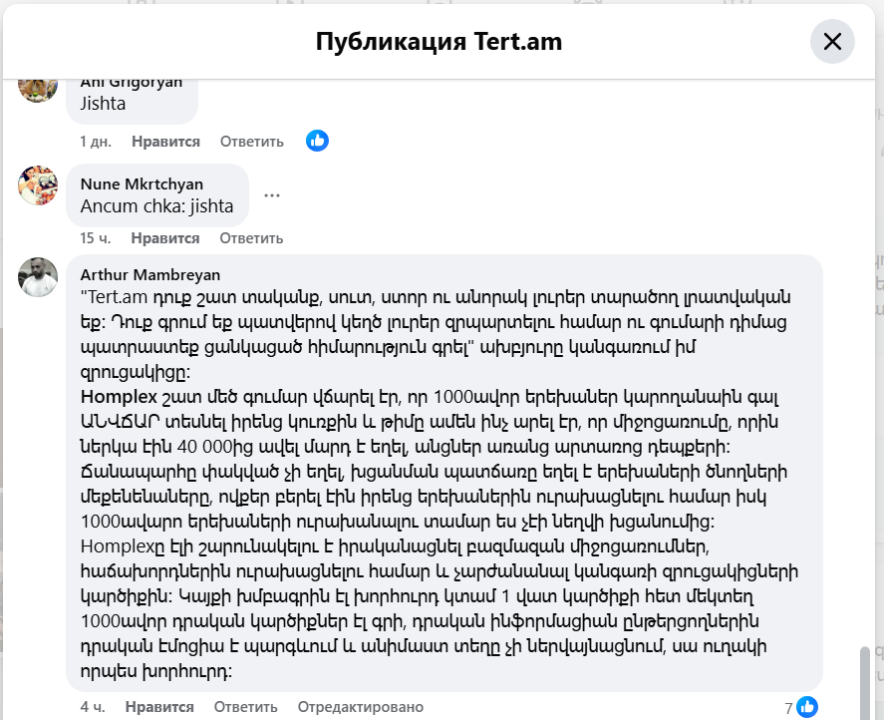 «Tert.am դուք շատ տականք, սուտ, ստոր ու անորակ լուրեր տարածող լրատվական եք։ Դուք գրում եք պատվերով կեղծ լուրեր զրպարտելու համար ու գումարի դիմաց պատրաստեք ցանկացած հիմարություն գրել" ախբյուրը կանգառում իմ զրուցակիցը»։