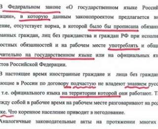 Ռուսաստանի Լիբերալ-դեմոկրատական կուսակցության պատգամավորները, ովքեր առաջարկել են ստիպել ներգաղթյալներին աշխատանքի ժամանակ ռուսերեն խոսել, բազմաթիվ սխալներ են արել օրինագծի տեքստում: Սխալնեով փաստաթուղթը հրապարակել է Էխո Մոսկվի ռադիոկայանի բլոգը: