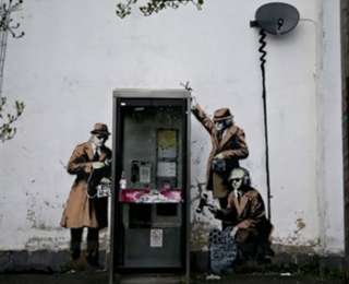 Գրաֆիտին, որն արվել է հեռախոսախցիկի շուրջ, պատկերում է գլխարկով և մուգ ապակիներով ականոցներով երեք մարդու, ովքեր միանում են հեռախոսային ավտոմատ սարքին՝ զրույցները լսելու համար: Գործակալները զինված են բարձրախոսներով ու ձայնագրող սարքերով: