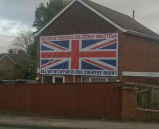 Խնդրանքը տպվել է ամբողջ տան պատով մեկ: Պաստառին տպված է Բրիտանիայի դրոշն ու գրառումը. «Շտապ դիմում ենք Սանտա Կլաուսին: Այն, ինչը մենք ուզում ենք, վերադարձնել մեր երկիրը»: