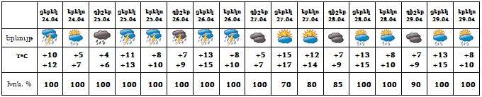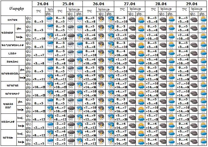 Հանրապետության տարածքում՝ ապրիլի 24-ի ցերեկը, 25-26-ը, 28-ի ցերեկը, 29-ի ցերեկը շրջանների զգալի մասում սպասվում են տեղումներ, առանձին վայրերում հնարավոր է ամպրոպ և կարկուտ: 24-25-ը լեռնային շրջաններում տեղումները կլինեն ձյան տեսքով: Ապրիլի 27-ին, 28-ի գիշերը սպասվում է առանց տեղումների եղանակ: