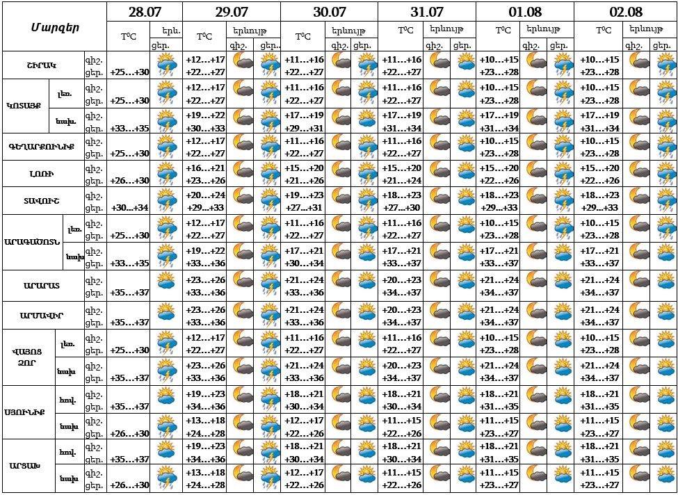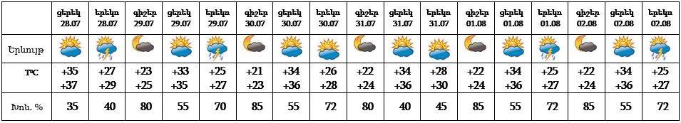 Երևան քաղաքում հուլիսի 28-ի երեկոյան ժամերին, 29-ին, օգոստոսի 1-2-ի գիշերը և երեկոյան ժամերին քաղաքի առանձին հատվածներում սպասվում է կարճատև անձրև և ամպրոպ, ամպրոպի ժամանակ` քամու ուժգնացում՝ 20-22 մ/վ: Հուլիսի 30-31-ը սպասվում է առանց տեղումների եղանակ։