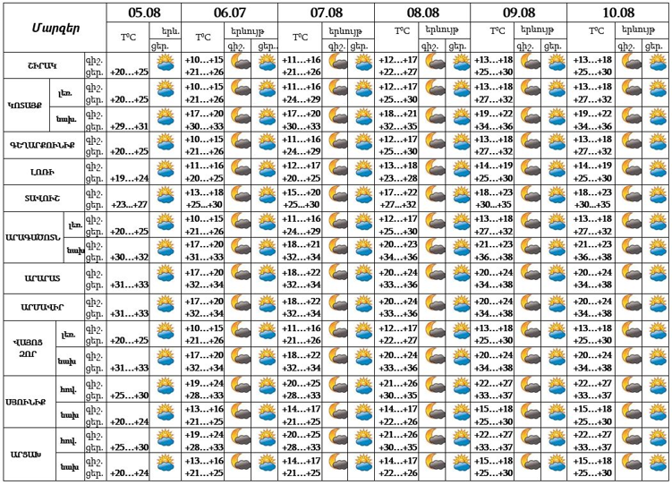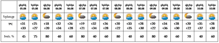 Հանրապետության տարածքում oգոստոսի 5-ի ցերեկը, 6-10-ը սպասվում է առանց տեղումների եղանակ։ Քամին՝ հարավ-արևմտյան՝ 3-8 մ/վ: Օդի ջերմաստիճանն օգոստոսի 5-9-ն աստիճանաբար կբարձրանա 4-6 աստիճանով։