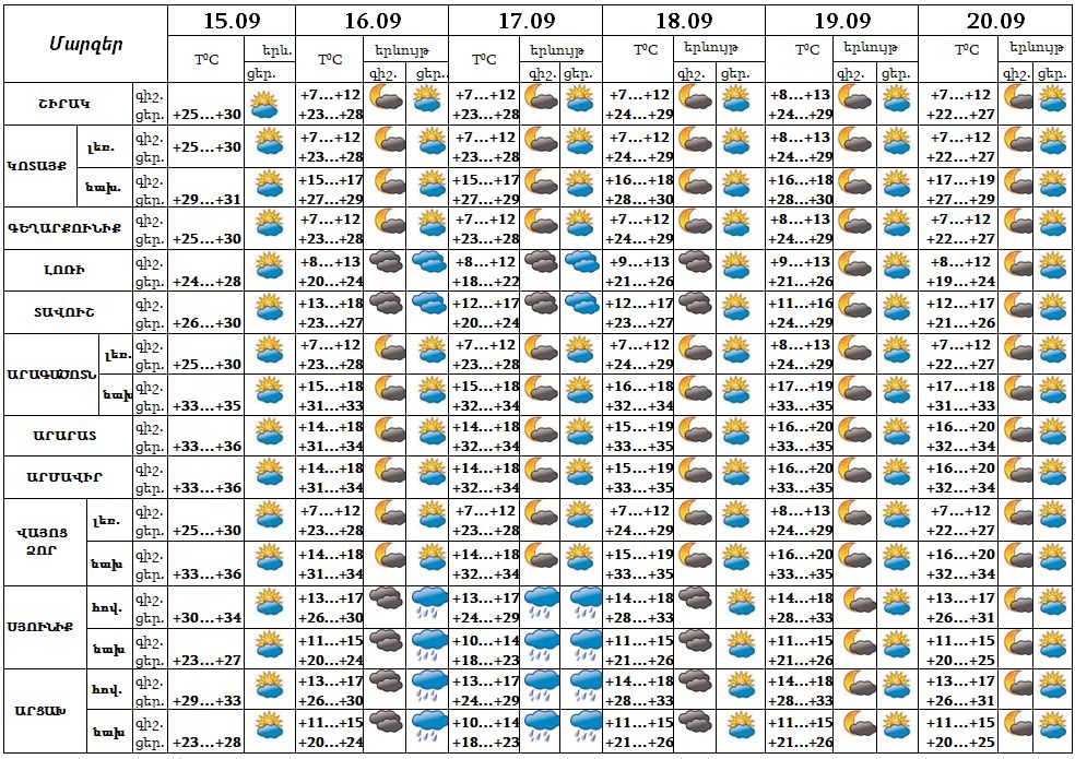 Օդի ջերմաստիճանը սեպտեմբերի 16-17-ը Լոռիում, Տավուշում, Սյունիքում և Արցախում կնվազի 4-6 աստիճանով, 18-19-ը նույնքան կբարձրանա: