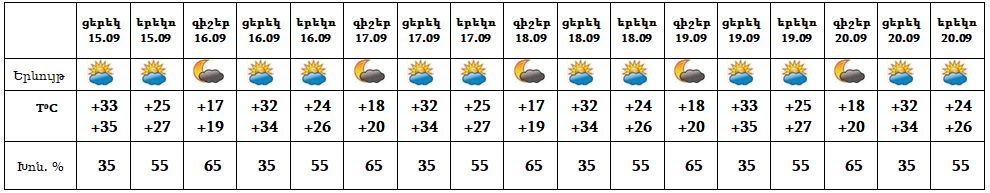 Երևան քաղաքում՝ սեպտեմբերի 16-ի ցերեկը, 17-21-ը սպասվում է առանց տեղումների եղանակ: