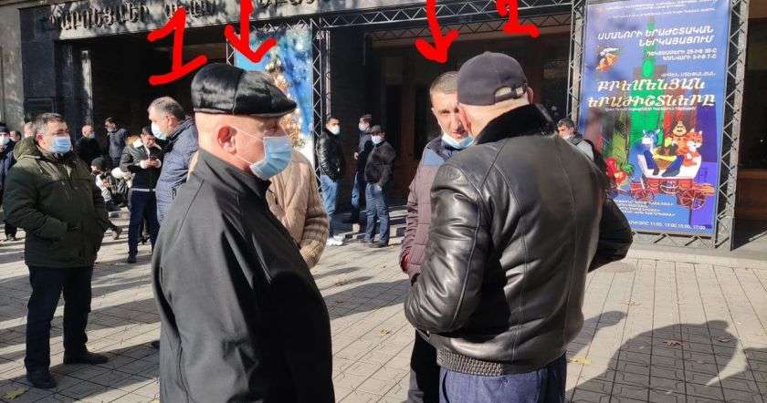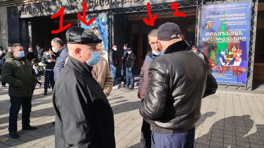 ՀՐԱՏԱՊ. ԱԻՆ աշխատակիցներին հրահանգված է հավաքվել Պարոնյան թատրոնի մոտ: Լուսանկարում 1-ը Մկրտչյան Արսենն է՝ ԱԻՆ ՃԿԱԿ պետի տեղակալը, 2-ը՝ Գևորգյան Արմենը՝ ԱԻՆ ՓԾ փրկարարական ուժերի վարչության պետը, որոնք համակարգում ենք մարդկանց երթի տանելու պրոցեսը: