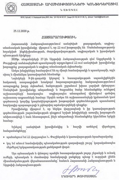 Նոյեմբերի 9-ին գաղտնի կերպով և հասարակության սպասելիքներին հակառակ ստորագրված եռակողմ հայտարարությունը հանրապետությունում առաջացրեց խորը ճգնաժամ, հանրության շրջանում խիստ լարված մթնոլորտ։ Ստեղծած իրավիճակը անդառնալի և ծայրահեղ ծանր հետևանքներ ունեցավ աշխատողների՝ հատկապես սոցիալապես անապահով վիճակում գտնվող աշխատող-աղքատների համար։ Արդեն առկա են աշխատատեղերի կրճատման կամ գործատուի կողմից կազմակերպության խաթարված գործունեության պատճառով հարկադիր պարապուրդի և չվճարվող արձակուրդների դեպքեր։