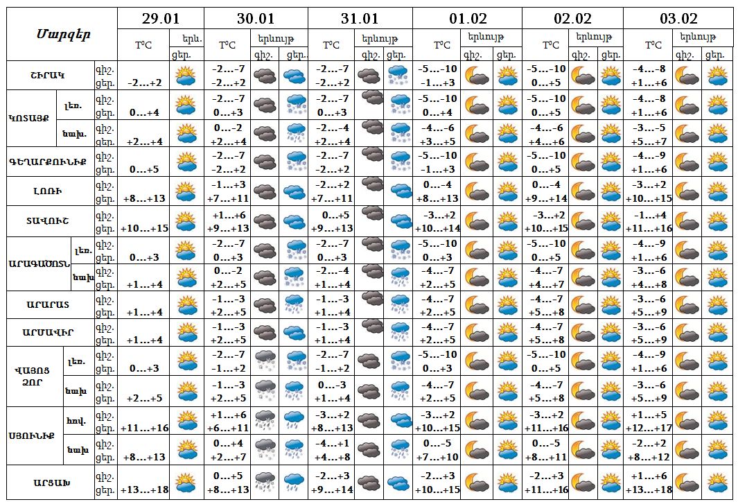 Հանրապետության տարածքում՝ հունվարի 29-ի ցերեկը, 31-ի գիշերը, փետրվարի 1-3-ը սպասվում է առանց տեղումների եղանակ։ Հունվարի 30-ին, 31-ի ցերեկն առանձին շրջաններում սպասվում են տեղումներ։