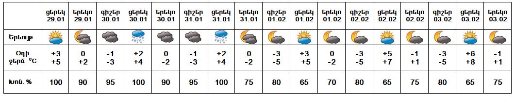 Երևան քաղաքում՝ հունվարի 29-ի ցերեկը, 30-ի և 31-ի գիշերը, փետրվարի 1-0-ը սպասվում է առանց տեղումների եղանակ։ Հունվարի 30-ի և 31-ի ցերեկը սպասվում է թույլ տեղումներ։
