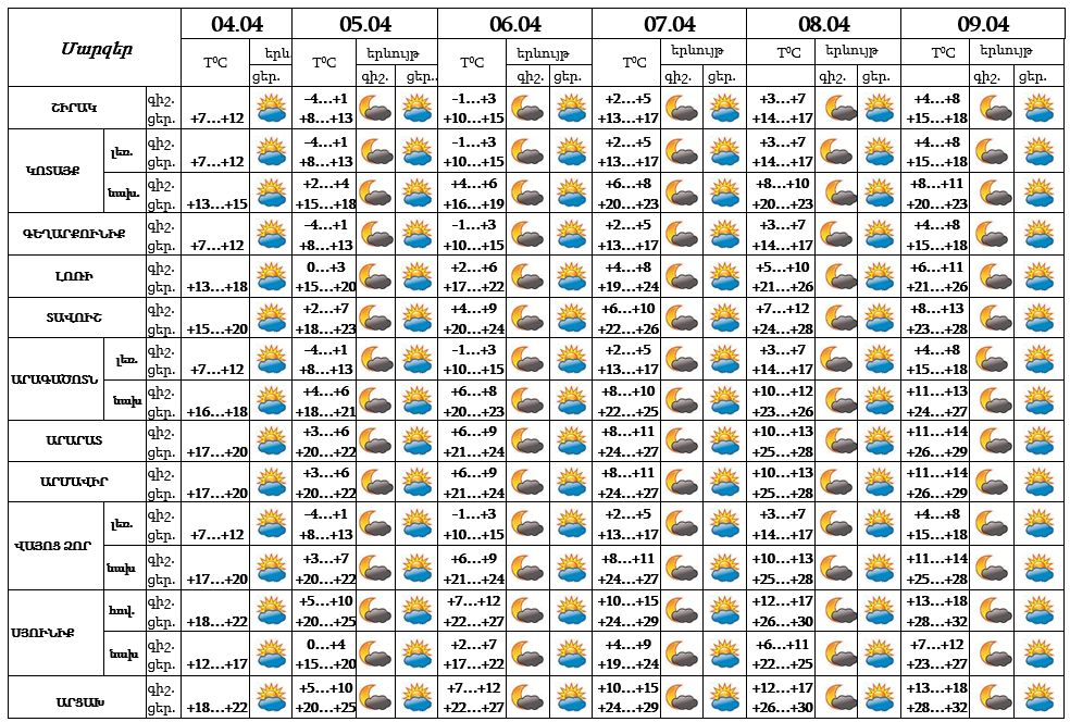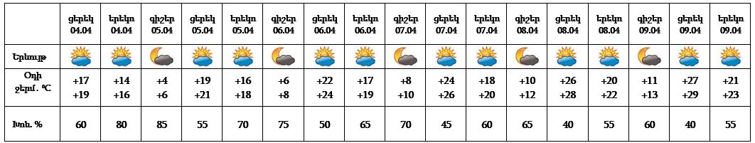 Քամին՝ հարավ-արևելյան՝ 2-5 մ/վ: Օդի ջերմաստիճանն ապրիլի 4-9-ն աստիճանաբար կբարձրանա 8-10 աստիճանով: