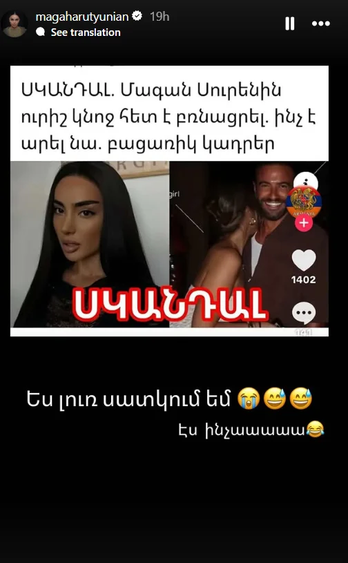 Մագան Ինստագրամի իր էջում տեղադրել է «սքրինշոթ», ըստ որի՝ ինքը «բռնացրել է» Սուրենին այլ կնոջ հետ։