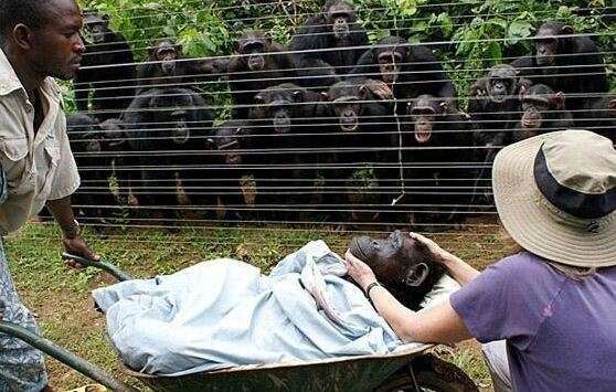 Կապիկին տանում են վայրի անտառից, մինչ նրա ընտանիքի անդամները սարսափահար դիտում են տեսարանը: