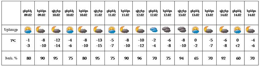 Օդի ջերմաստիճանը փետրվարի 9-11-ն աստիճանաբար կնվազի 18-20 աստիճանով, 13-14-ը կբարձրանա 6-8 աստիճանով: