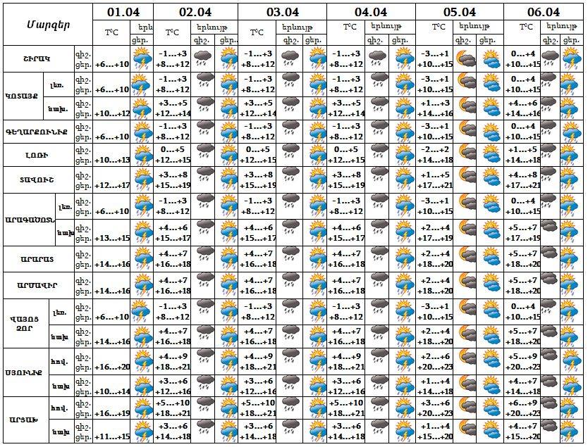Երևան քաղաքում՝ ապրիլի 1-ի ցերեկը, 2-4-ին, 6-ին ժամանակ առ ժամանակ սպասվում է կարճատև անձրև և ամպրոպ, ամպրոպի ժամանակ հնարավոր է քամու ուժգնացում մինչև 14-17մ/վրկ արագությամբ։