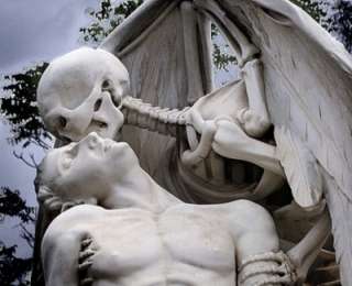 Памятник «Поцелуй смерти», Барселона, кладбище Побленоу, 1930 год. Скульптор неизвестен, авторство приписывается либо Жауме Барба, либо Жоану Фонбернату. Говорят, именно эта скульптура вдохновила кинорежиссера Бергмана на создание фильма «Седьмая печать» — об общении Рыцаря и Смерти.