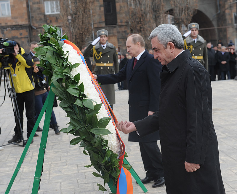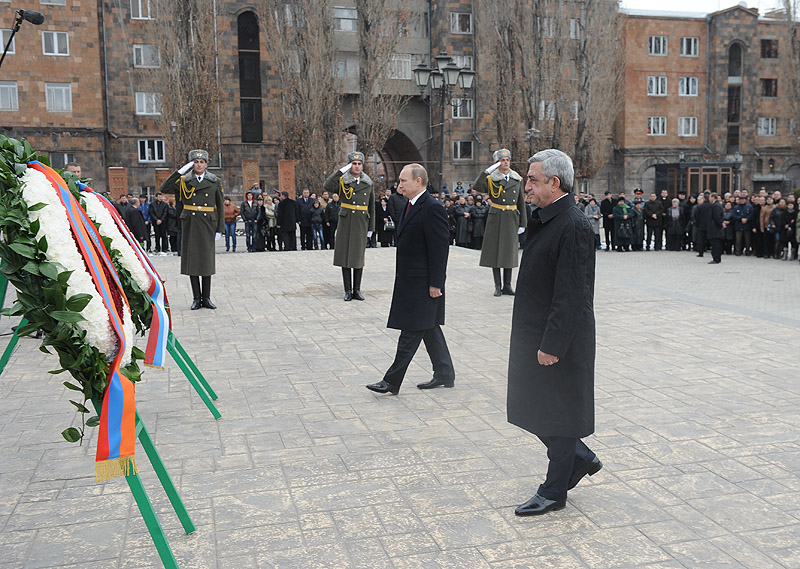 Президент Серж Саргсян и прибывший по его приглашению в Республику Армения Президент Российской Федерации Владимир Путин сегодня после открытия Третьего межрегионального армяно-российского форума в Гюмри, в преддверии 25-й годовщины Спитакского разрушительного землетрясения 1988 года возложили венок к мемориалу, посвященному памяти жертв землетрясения, а также спасателям и всем государствам и народам, протянувшим руку помощи Армении. *** Дополнительные сведения о мемориале памяти жертв землетрясения 1988 года Открытие мемориала состоялось 7 декабря 2008 года в связи с 20-й годовщиной разрушительного землетрясения 7 декабря. Скульптурная композиция была создана народным художником России и Украины, заслуженным художником Армении, лауреатом Ленинской премии, уроженцем Гюмри Фридом Согояном. Медная скульптура содержит семнадцать человеческих фигур, которые составляют скульптурную композицию. Смысл мемориала выражается краткой формулировкой: “Невинным жертвам, милосердным сердцам”. Памятник высотой в семь метров символизирует боль народа, пережившего жестокий удар стихии, а с другой стороны - его мужество, которым он возрождается из руин. Памятник был изготовлен в московской мастерской Фрида Согояна, откуда самолетом был доставлен в г. Гюмри. Рядом с мемориалом расположены пять каменных плит, на которых написаны история землетрясения, а также имена тех милосердных людей и стран, которые с первых минут бедствия протянули руку помощи армянскому народу. В деле создания и транспортировки памятника большую помощь оказал Николай Иванович Рыжков, который в то время руководил Попечительским советом по увековечению памяти жертв землетрясения. Фрид Согоян является и руководителем авторской группы открывшегося сегодня в Ереване памятника «Единый крест», символизирующего вековую дружбу армянского и русского народов.