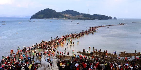 Изменения уровня моря, связанные с приливом, являются причиной явления известного как «Чудо Моисея» (Moses Miracle). В ходе этого явления между островами Чиндо и Модо, находящимися в уезде Чиндо (Jindo County), провинции Чолла-Намдо (South Jeolla), открывается полоса земли, длина которой составляет 2,9 километра, а ширина от 10 до 40 метров. ![]()