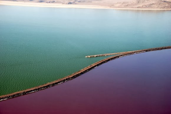 Необычная окраска частей озера является прямым следствием постройки дамбы. Изначальная эстакада позволяла воде свободно протекать под железнодорожными путями, но насыпная дорога, построенная на её месте, по сути, является 32-километровой дамбой. Дисбаланс соли образовывался на протяжении многих лет, потому что южная часть озера получает почти всю пресную воду. ![]()