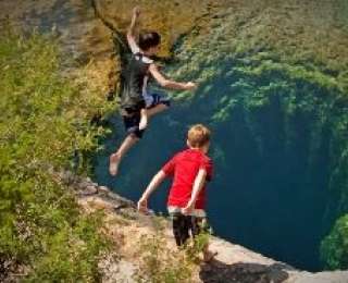 На фотографии два мальчика прыгают в бездну - это колодец Иакова, который находится в штате Техас. Колодец Иакова — большой артезианский источник, 4 метра в диаметре, вытекает из самой обширной подводной системы пещер в штате Техас. Вода в нем настолько прозрачна что при прыжке создается ощущение прыжка в пустое пространство.