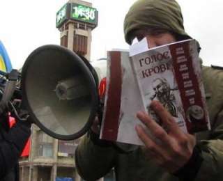 Заметьте, они еще не «титушки» и не «провокаторы», с точки зрения организаторов «евромитингов»! Они открыто каждый день выступают с трибуны «евромайдана», открыто пропагандируют свои расистские взгляды, стоя аккурат под флагом ЕС, зачитывают стихи из ксенофобского сборника «Голос крови». И никто из организаторов митинга их не одергивает, не отмежевывается от них.
