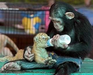 3. Еще одна шимпанзе кормит тигренка.