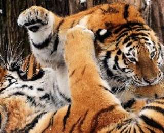 Сибирские тигры играют в зоопарке Двур Кралове, Чехия.